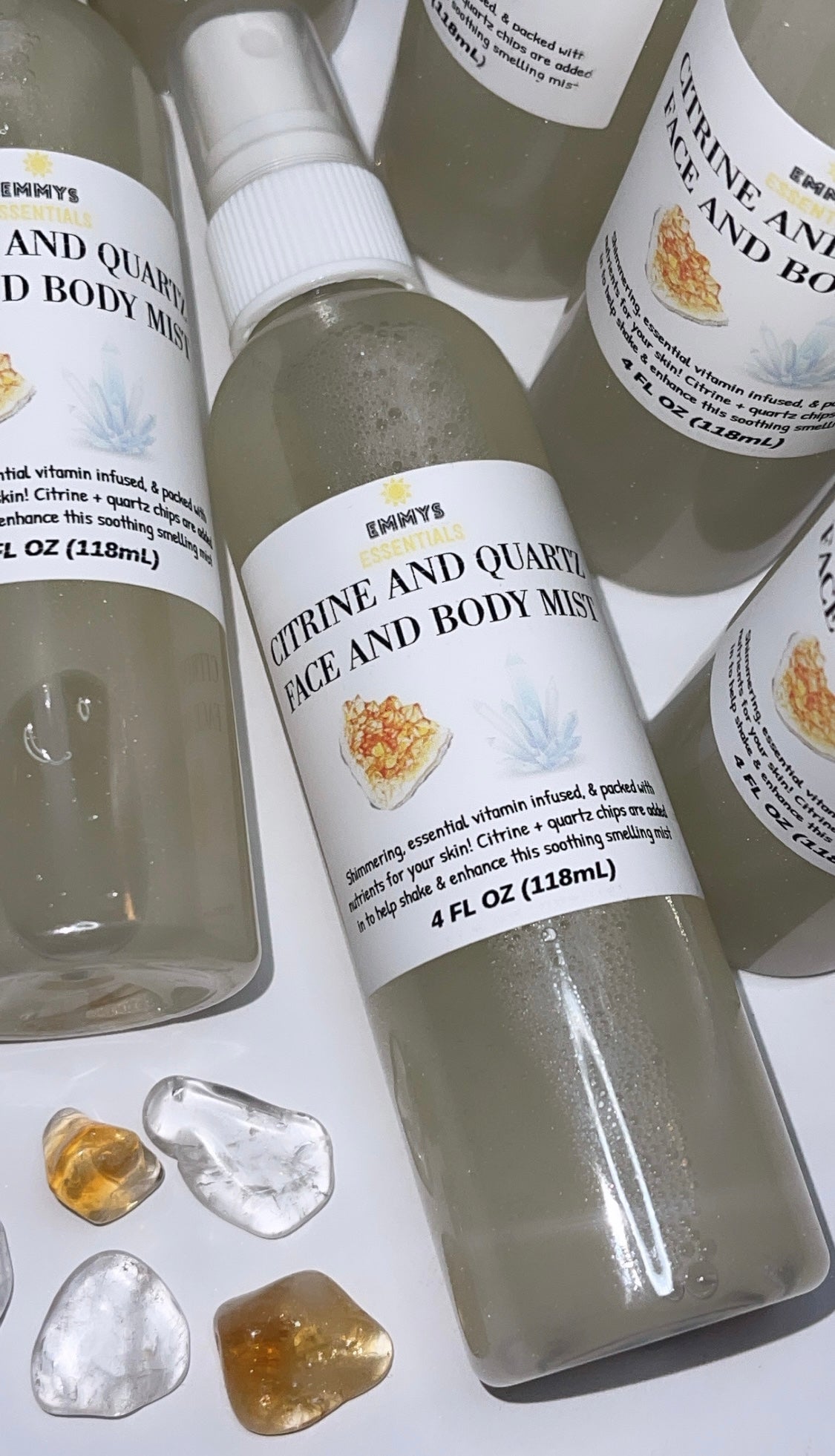 Need a refreshing glow? A shimmery body mist? Dewy makeup setting mist? Then pick up one of these beneficial CRYSTAL infused sprays! 😍 This hydrating formula has loads of aloe, skin loving vitamin c, glycerin, and extracts to have your skin glowing, healthy, and hydrated! Mist all over the body, or face whenever needed. Citrine chips and a clear quartz tumble help shake up this gorgeous champagne-gold mist. Full of biodegradable, skin safe shimmer that will surely satisfy you! 🙌🏻 Set intentions of misting yourself with “luck” and clear thoughts for the day/night.